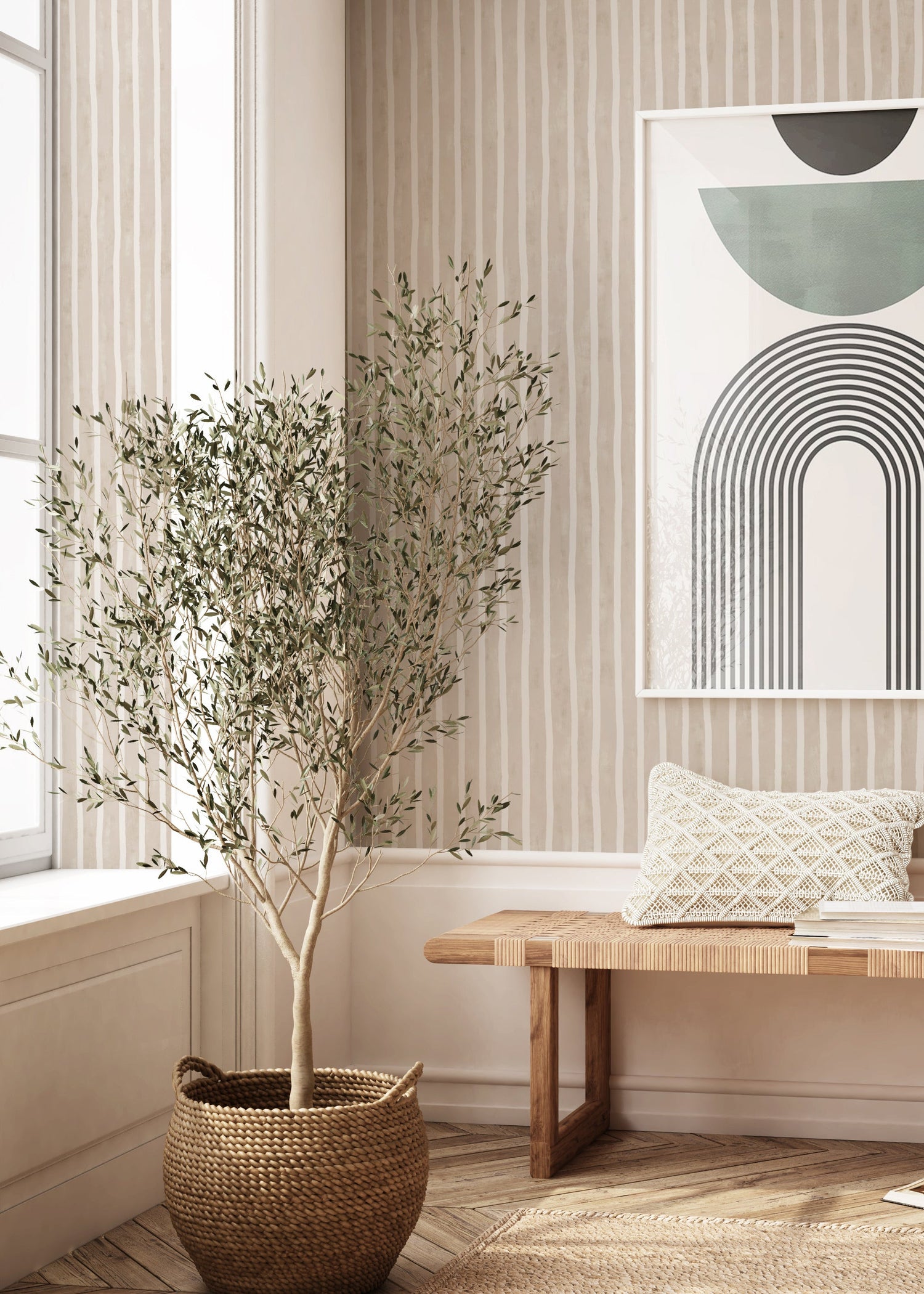 Inspiriert von traditionellen Ateliers und bewährten Dekorationstechniken verbindet dieses Design rustikalen Charme mit klassischer Eleganz. Jeder Streifen zeigt subtile Variationen in Pinselstrich und Textur und schafft einen sanft unvollkommenen Rhythmus, der warm, authentisch und lebendig wirkt. Im Gegensatz zu flachen, einheitlichen Drucken offenbart Atelier Stripe die Kunstfertigkeit hinter dem Muster – man kann fast die Hand des Malers bei der Arbeit sehen.