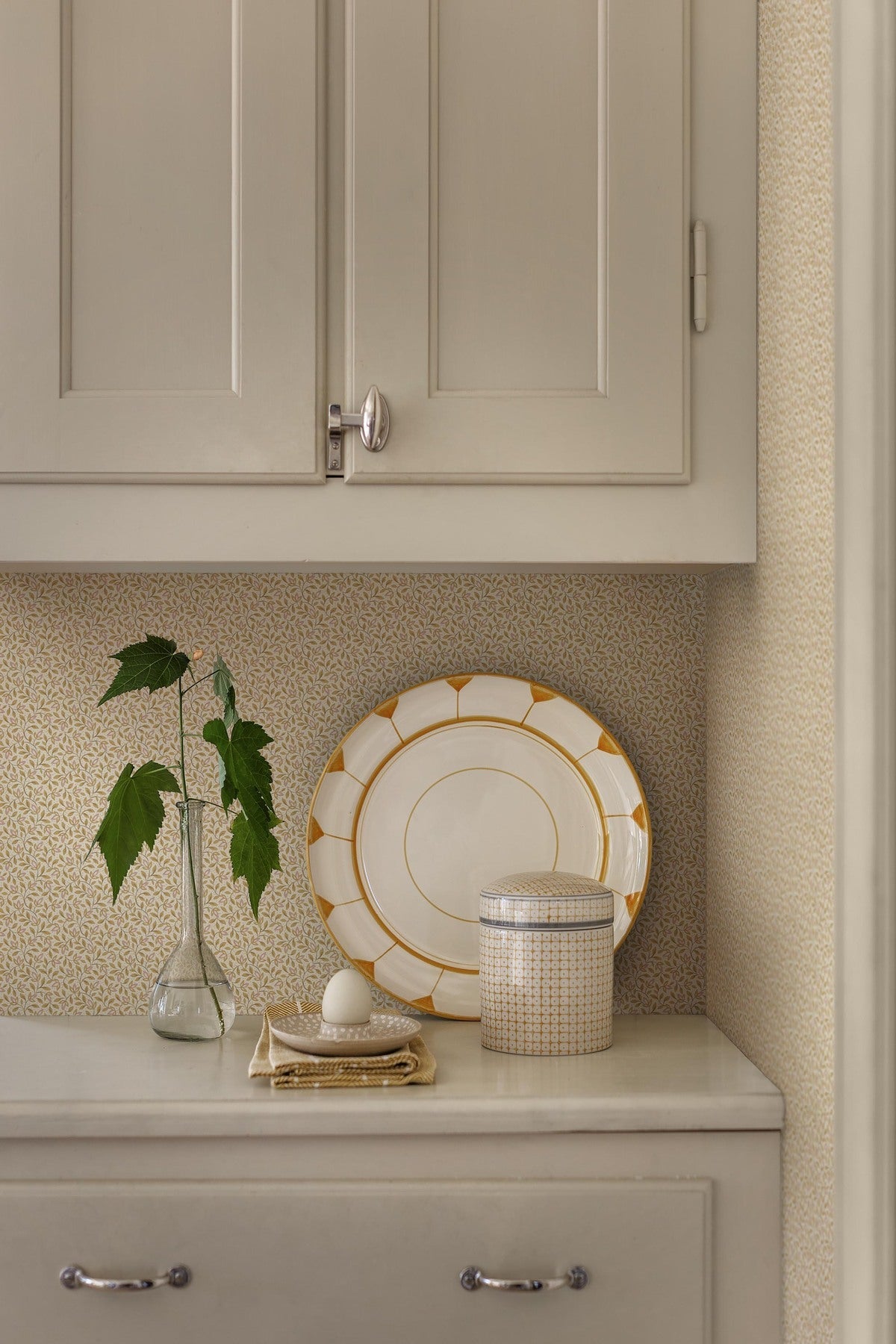 In warm beige tones, our Ida wallpaper reveals a graceful vine pattern of soft leaves and slender stems. From afar, it appears as a calm, almost solid surface; up close, the pattern’s beautiful and intricate detailing becomes visible.