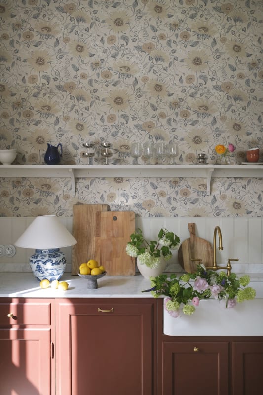 It Solveig, Clay wallpaper Van Sandberg catches the essence of Öland with a flower festival of sunflowers, poppies and chicory. This refined pattern combines a warm beige base Decorated with flowers in muted shades of warm yellow, beige and pink with green leaves. Ideal for creating a quiet, natural atmosphere in children's rooms and living spaces.