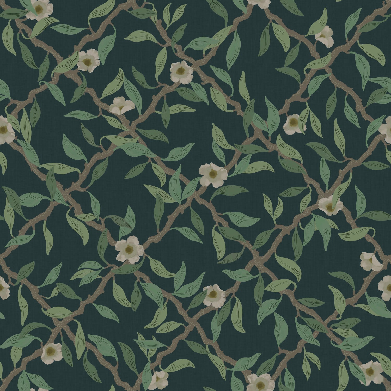 Die Spalier-Tapete ist in mehreren Farbschemata erhältlich. Hier sehen Sie die Tapete mit grünen Blättern auf nachtblauem Hintergrund.