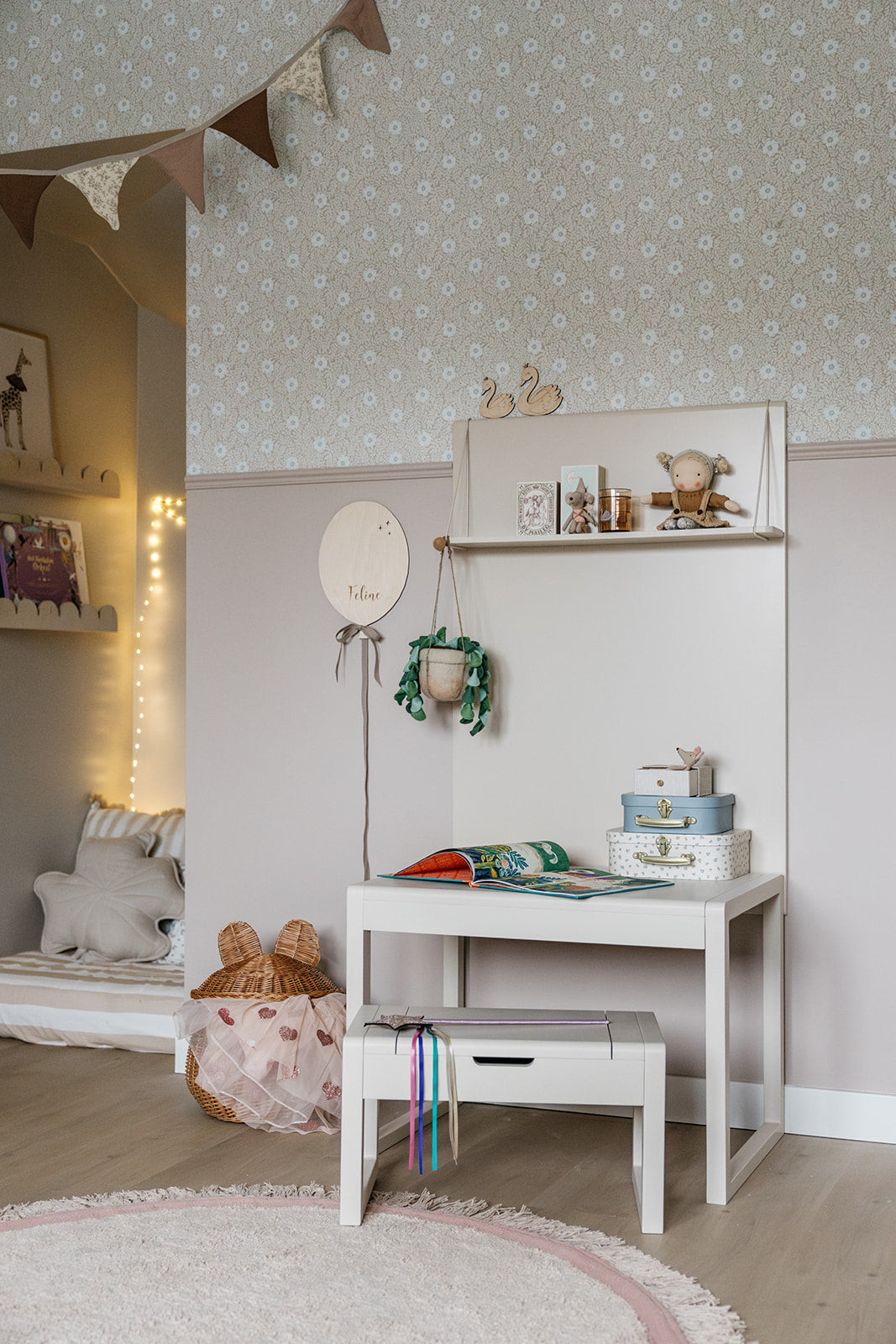 Das schlichte Muster sieht besonders gut im Kinderzimmer oder in der Küche aus und passt hervorragend zu Holzarbeiten wie Täfelungen perfekt.