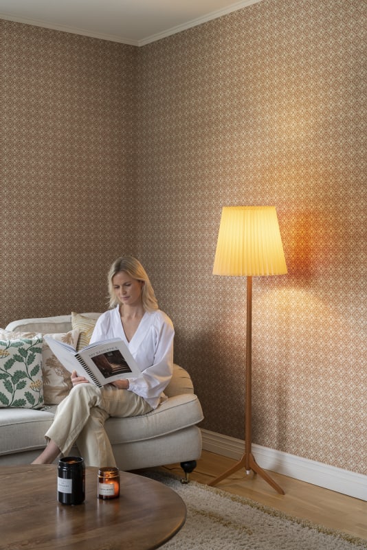 Lyckan heeft grafische bloemen die zijn gerangschikt binnen geometrische tegels voor een retro uitstraling. Het tweekleurige palet zorgt voor harmonie op de muren van elk interieur.