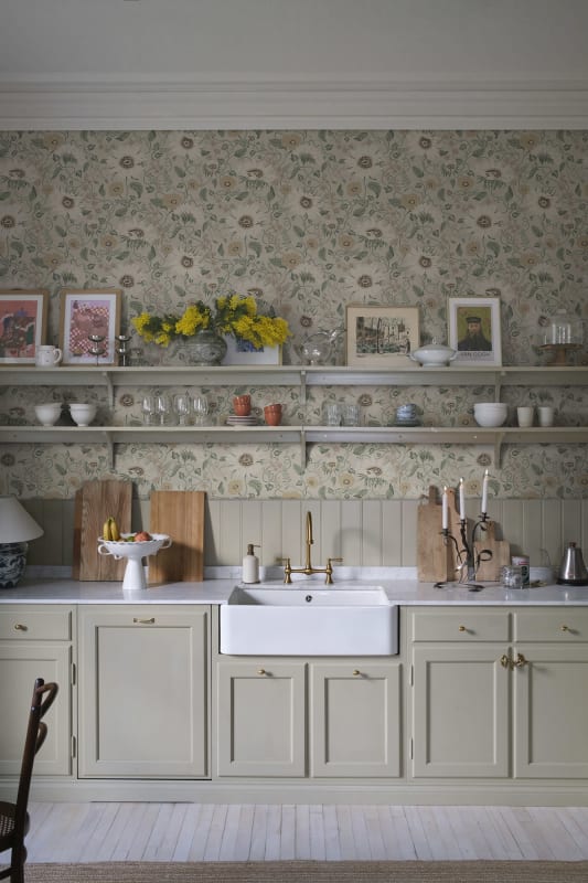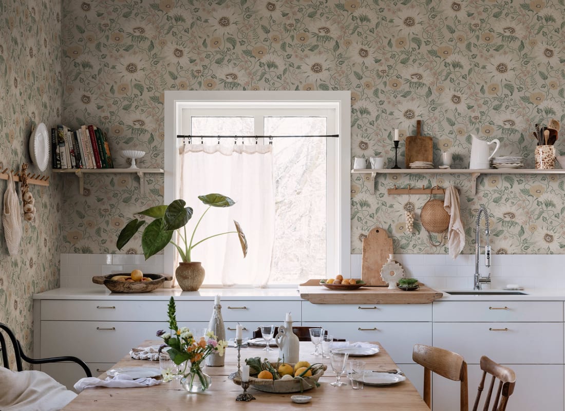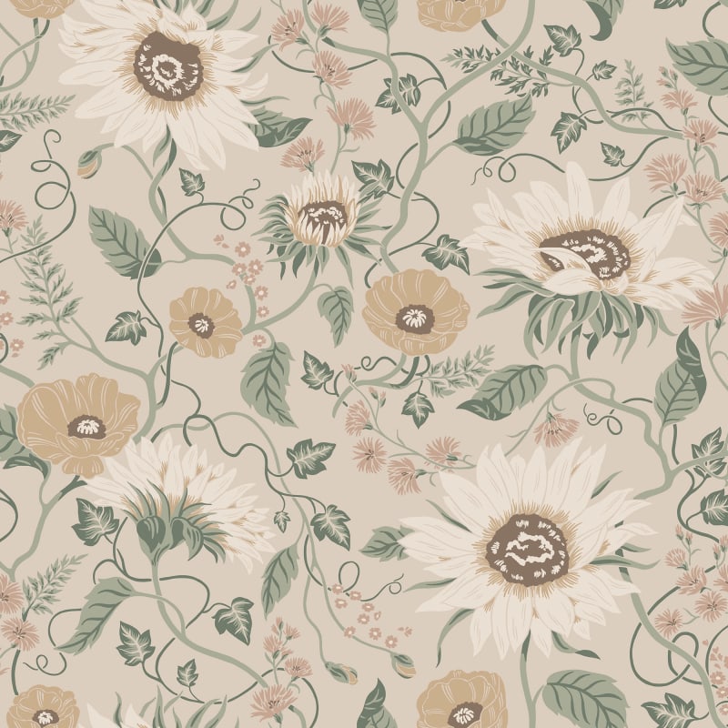 It Solveig, Clay wallpaper Van Sandberg catches the essence of Öland with a flower festival of sunflowers, poppies and chicory. This refined pattern combines a warm beige base Decorated with flowers in muted shades of warm yellow, beige and pink with green leaves. Ideal for creating a quiet, natural atmosphere in children's rooms and living spaces.