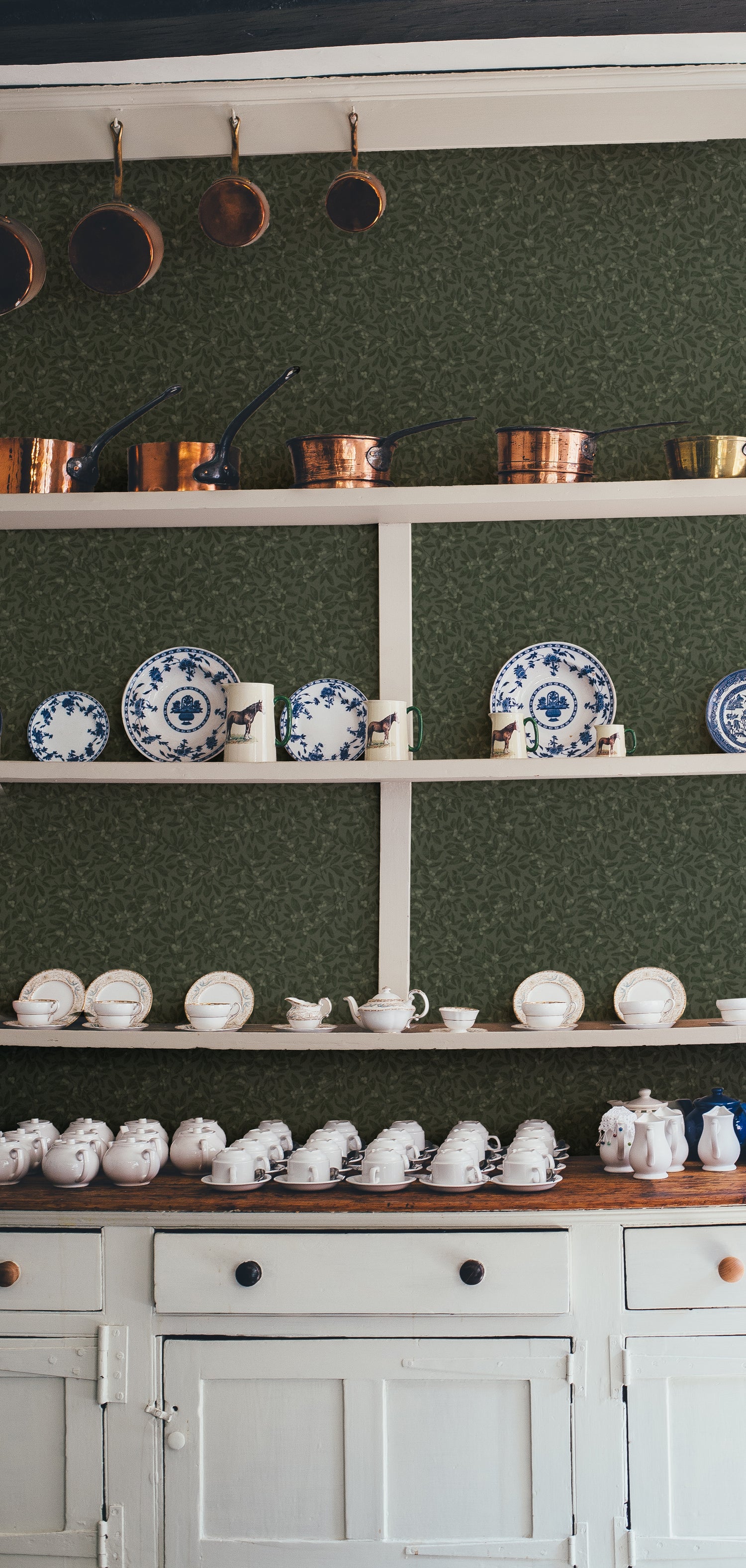 A delicate tangle of leaves and clusters of berries weave together to form the intricate and abundant design of Junia wallpaper. This hand-drawn pattern captures the untamed charm of a hidden garden and invites its quiet beauty indoors.