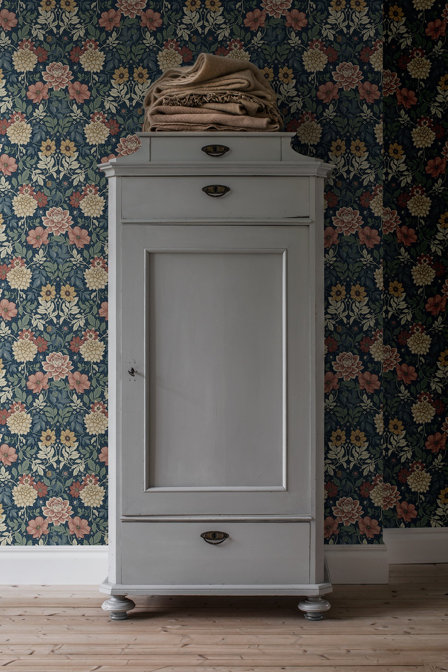The Dahlia Garden's flamboyant floral pattern was hand-painted by designer Jenny Hahne Gadd just a few years ago. Here, however, there are strong influences from the Arts & Crafts movement, and this particular color scheme with a blue background feels so typical of Arts & Crafts - playful, but still gentle and collected.