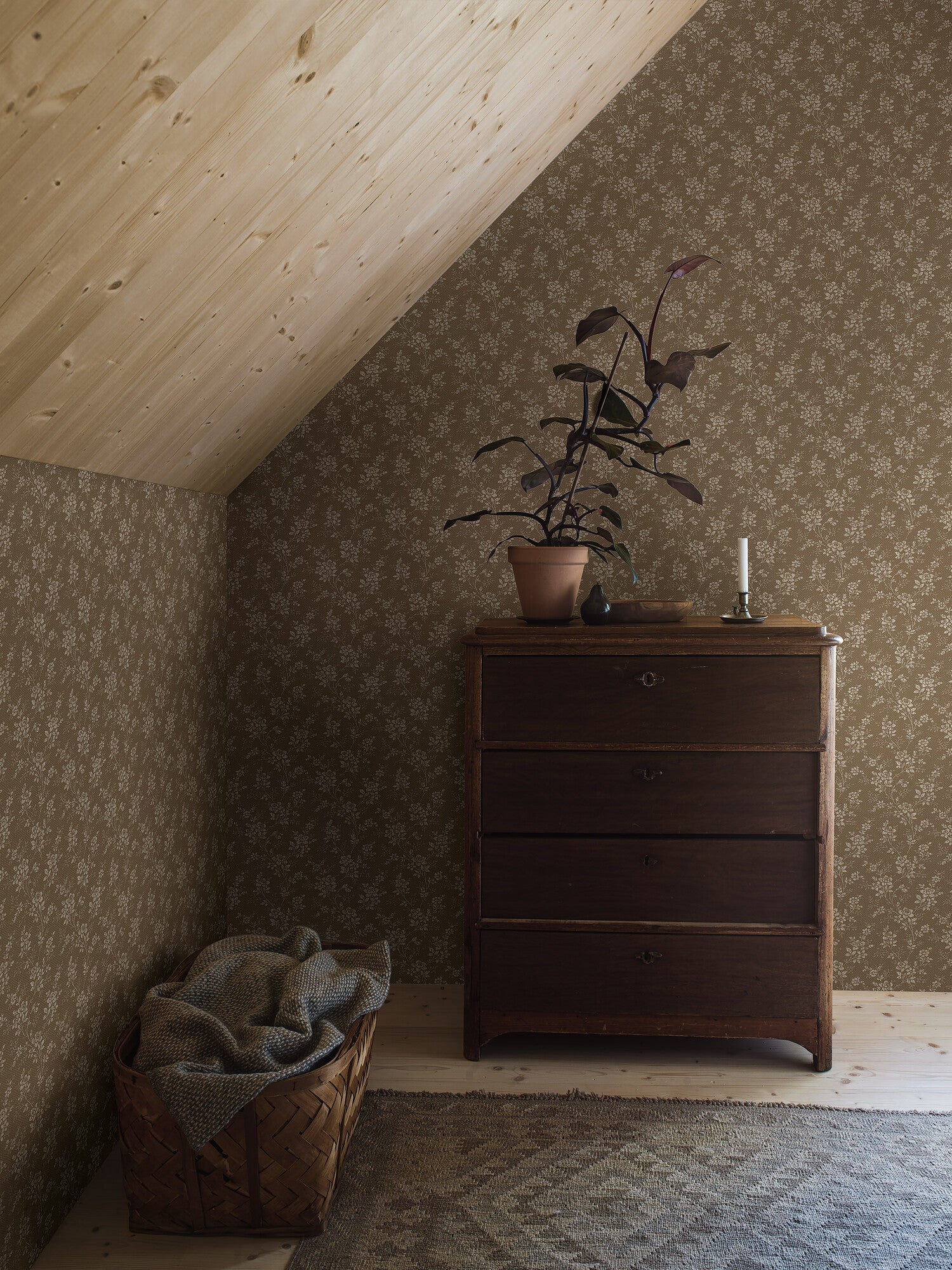 Coloured in a rich and warm brown palette, our Hip Rose wallpaper is elegant yet comforting. With its sweet and delicate floral pattern, it is traditional yet modern, giving the room a harmonious feel.