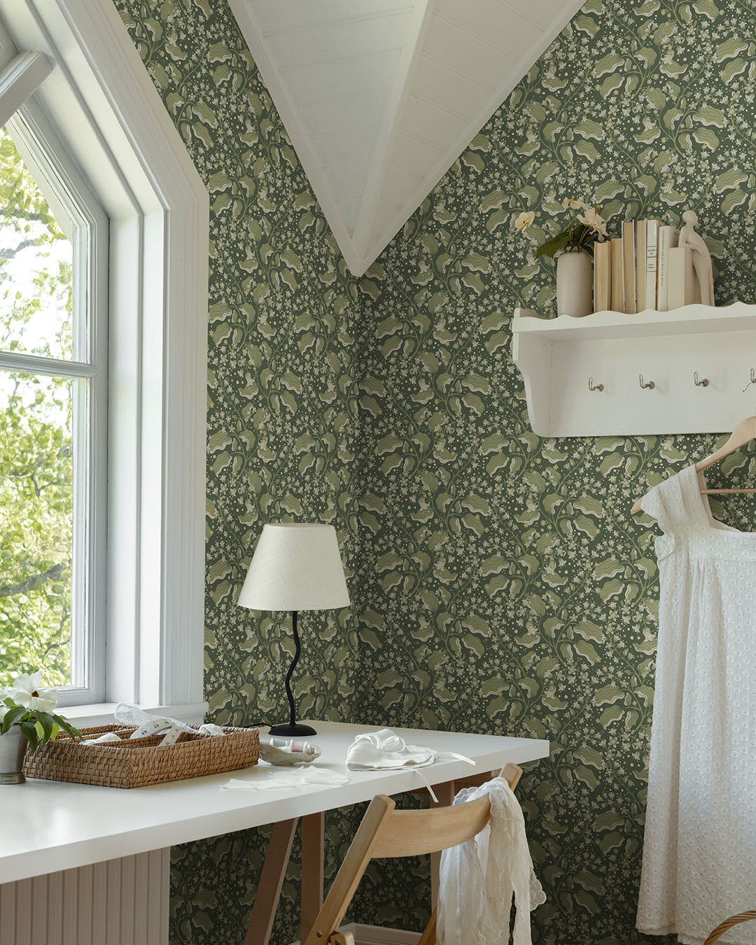 Syrén is a pleasantly beige wallpaper where the fragrant lilac bush, with its delicate blossoms, spreads gracefully across the wall. It transports you to bright, tranquil summer evenings when the sweet scent of flowers fills the air. A moment to pause, cherish, and remember. With its monochrome palette of beige tones, the wallpaper brings a serene and calming impression to the room.