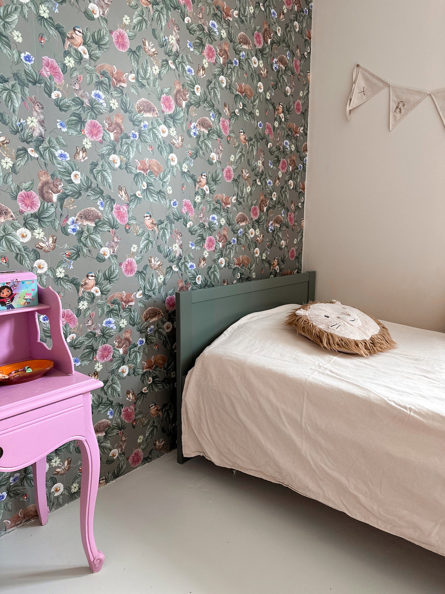 Out of unconditional love and a wish to support children’s fascination for all things natural, this wallpaper filled with wild flowers, leaves, daisies, clovers and the sweetest forest friends was dreamt into this world to create the most magical nursery.